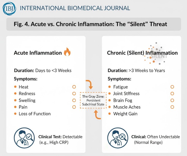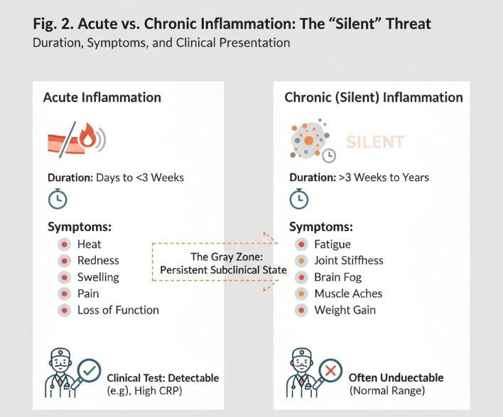 하지만 우리 몸은 그렇게 단순하지 않습니다. 회색 지대가 있습니다. 바로 '만성염증' 단계입니다.