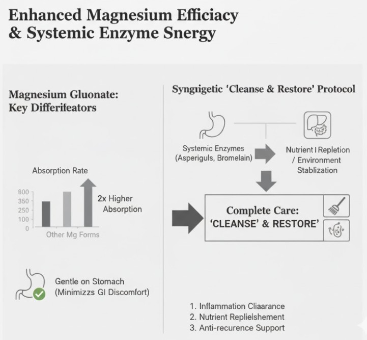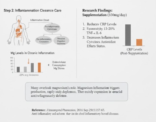 많은 사람들이 놓치는 부분이 있습니다. 염증 반응이 일어날 때 우리 몸은 염증성 물질을 만들어냅니다. 이 과정에서 마그네슘이 소모됩니다.