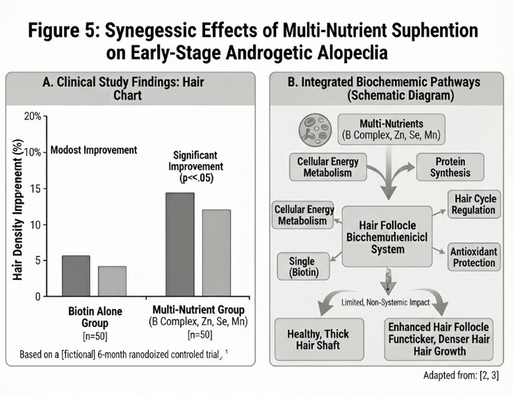 비타민 B군 전체와 아연, 셀렌 같은 미량 영양소를 함께 섭취한 그룹에서 모발 밀도 개선이 더 뚜렷하게 나타날 수 있다는 것이죠.