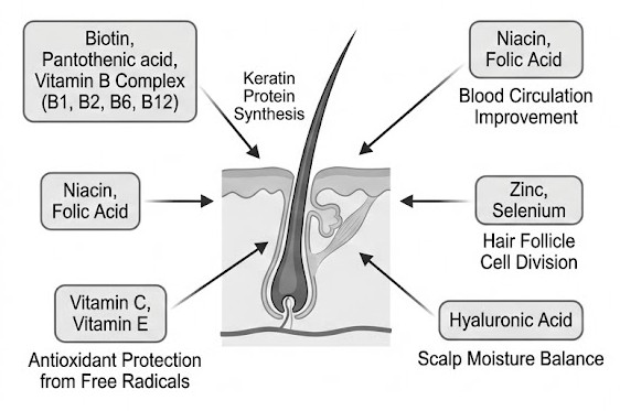 비오틴, 판토텐산, 비타민 B군(B1, B2, B6, B12)은 모발 단백질 합성의 기본 재료입니다.